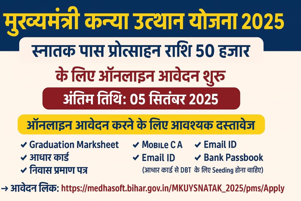 मुख्यमंत्री कन्या उत्थान योजना 2025: स्नातक पास छात्राओं को 50,000 रुपये प्रोत्साहन राशि, ऑनलाइन आवेदन शुरू बिहार सरकार लगातार बालिकाओं